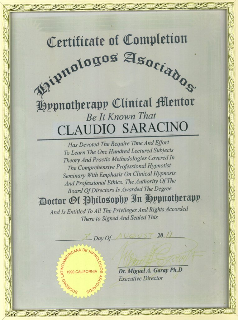 Mi laureo e mi certifico, a Los Angeles, Hypnoterapist clinico metodo Brunini-Garay , ipnosi che vanta qualche secolo di storia e di fatti sudamericani ispanici, e che affronta tutto dell’essere umano, in tutti i campi possibili e immaginabili…